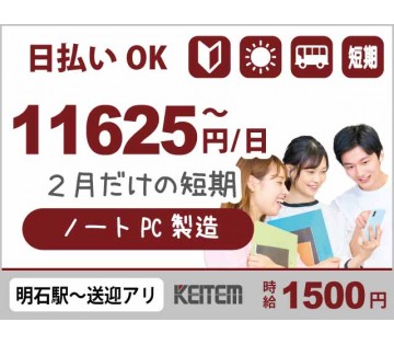 ※この仕事は「短期(3ヶ月未満)」での勤務となる求人です 【仕事内容】 【仕事No.4881】 【ノートPCのカンタン製造】 ノートパソコンを作る、大手メーカーの工場でのお仕事です。 短期でもすぐに覚えられる簡単な作業をお任せします。 ▼仕事詳細 <組立> 1)小さなビス(1~2mm程度)のネジ締め 2)シート・シールの貼り付け 3)ケーブルの差し込みや配線 <検査> 1)製品を検査機にかけて品質検査 2)キズや汚れがないか目視でチェック 【求人担当者からヒトコト】 未経験でも始めやすい作業だけ◎ 重たい物もなく、身体への負担も少ないです。 各ラインにリーダーがおり、 すぐに相談できる安心の環境です! (1)接客なし×短期集中の稼げるカンタン製造ワーク (2)15日間出勤で月収21万円以上稼げるチャンス! (3)土日祝日はた~っぷり遊べる!平日のみの勤務 ■□交通・アクセス□■ 車・バイク・自転車通勤OK <送迎バスあり> 「明石」駅・「西神中央」駅より 無料送迎バス運行中! <最寄り駅からのアクセス> ★神戸市営地下鉄西神・山手線「西神中央」駅より車6分 ★JR神戸線「明石」駅より車28分 <近隣アクセス> 「デイリーヤマザキ 西神工業団地店」より車3分 ■こんな方が活躍中!■ 20~40代活躍中! 【ここがポイント】 【通勤】※各規定あり ■車・バイク・自転車通勤可 ■無料送迎バスあり ■通勤交通費支給 ※2km以上の通勤でガソリン代も支給 【就業先】※各規定あり ■社員食堂あり(1食180円~470円) ☆丼もの、麺類、幕の内弁当などメニュー豊富! ■自動販売機あり ■湯沸かし器・給水機完備 ■売店あり ■休憩室あり ■喫煙スペースあり ■更衣室・ロッカー完備 ■空調完備 【【待遇】:求人に関する補足事項】 【待遇】※各規定あり ■日払い制度 ■仮払い制度 ■作業服貸与 ※帽子・作業着・安全靴など :・業務内容、勤務地は会社の定める内容に変更となる可能性があります。 ・更新は契約期間満了時の業務量、業務の進捗状況、労働者の能力、業務成績、勤務態度、当社の経営状況、派遣先の状況のいずれかによって判断します。 ・22時以降の勤務が発生する場合、18歳以上の方のみ勤務頂きます。 ・受動喫煙対策あり、詳細は面接時にお伝えします。 交通費支給/日勤のみOK/日払い/カップルOK/アウトドアが近い/遊び場が近い/キャリアアップができる/資格・免許取得支援あり/車・バイク通勤OK/コンビニが近い/観光スポットに近い/近くにATM有/女性が多い職場/制服あり/友達・仲間と一緒に働く/大手企業/経験者優遇!/未経験OK/資格・免許を活かせる |